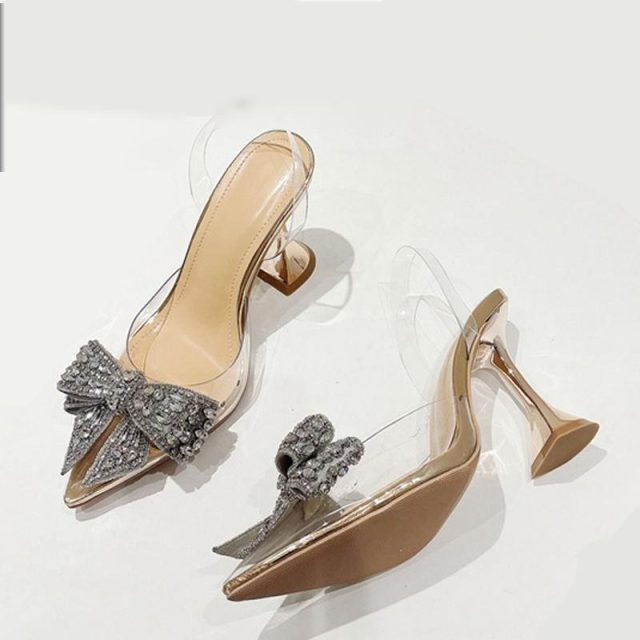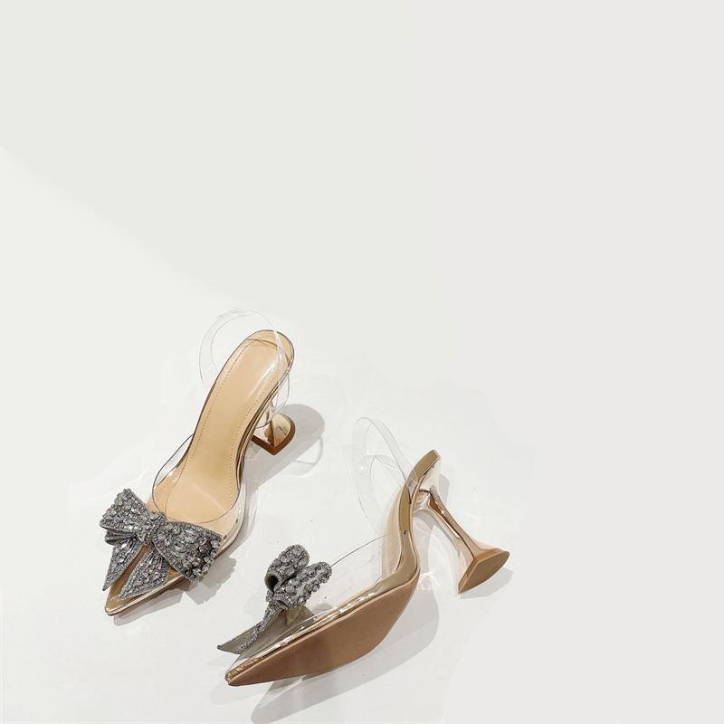 Liyke Fashion Crystal Sequined Bowknot Women Pumps Sexy Pointed Toe High Heels Wedding Prom Shoes Ladies PVC Transparent Sandals