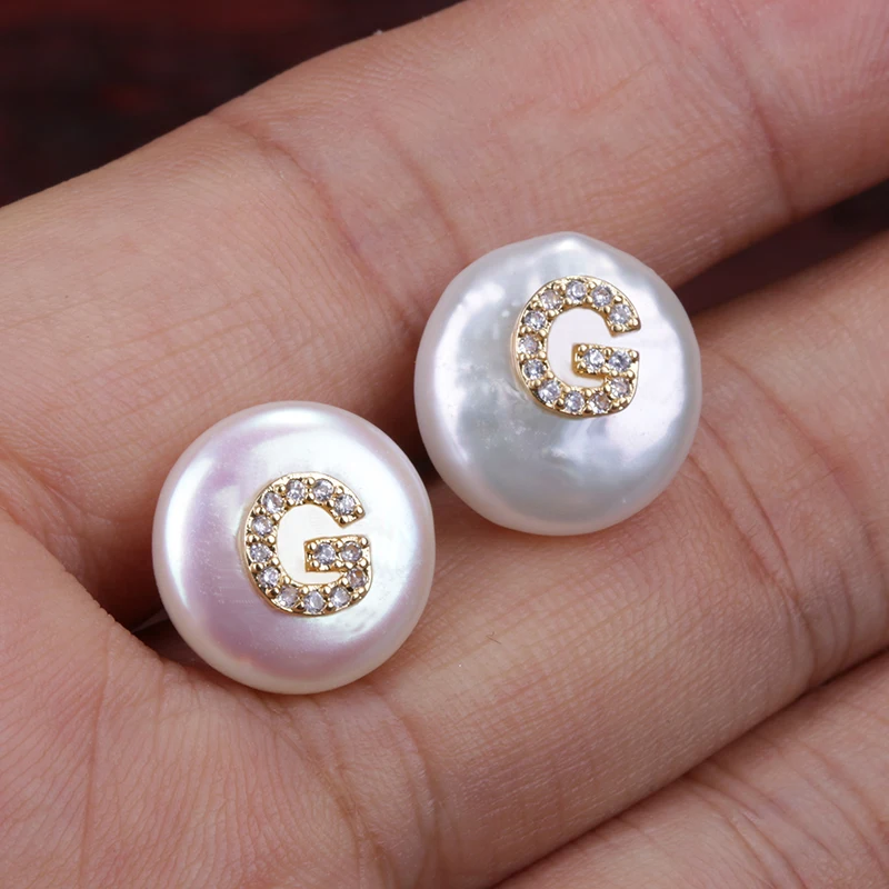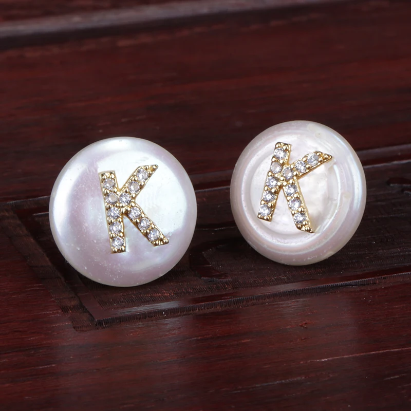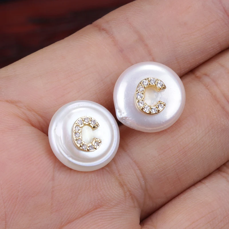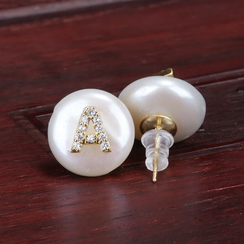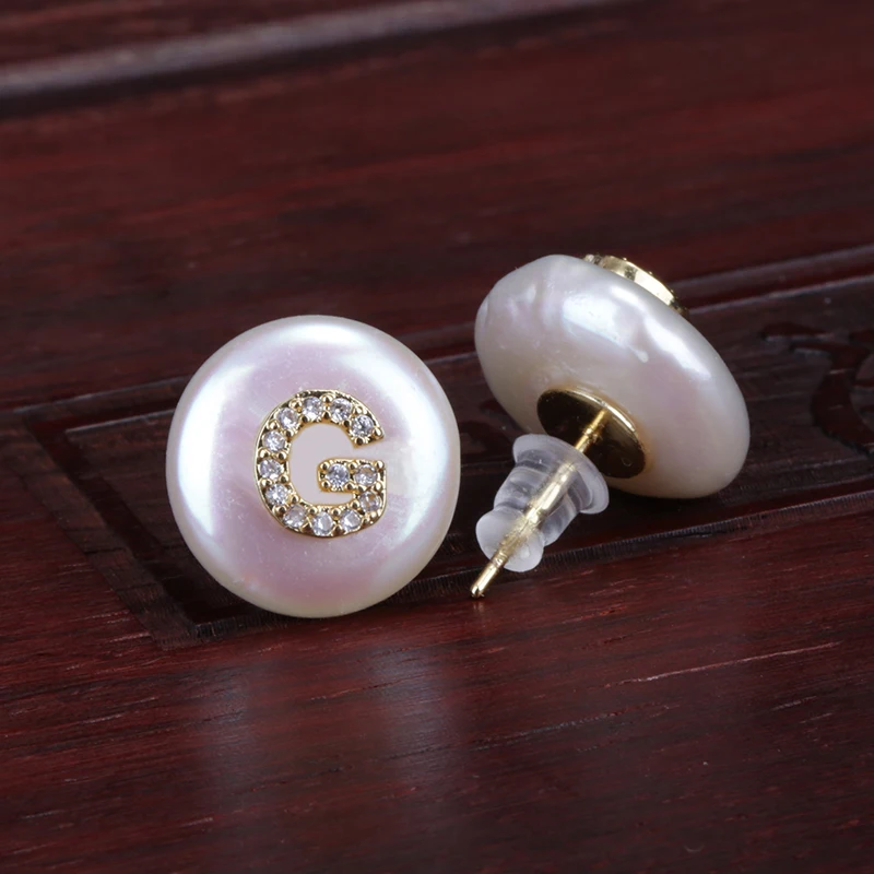 CZ Initial Over Natural Coin Pearl Studs